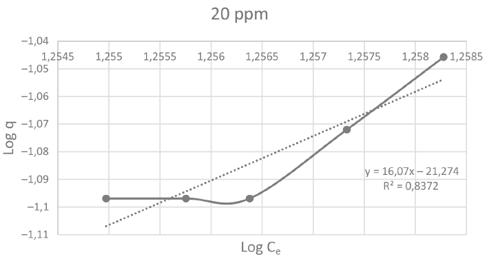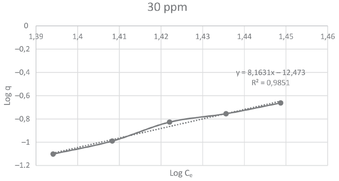 Por otro lado, para obtener las isotermas de Freundlich se graficaron los datos del logaritmo base 10 de la concentración en el equilibrio (log Ce) versus el logaritmo de la capacidad de adsorción de Azolla caroliniana (log q). Los valores numéricos relacionados con la afinidad del bioadsorbente por los iones metálicos K (L/g) y el parámetro afín con la intensidad de la absorción (n) fueron obtenidos de la pendiente y la intersección de la forma lineal de la isoterma de Freundlich (Herrejón et al.,2008).