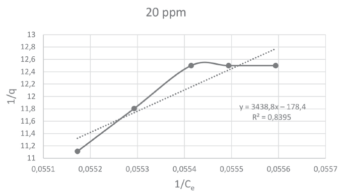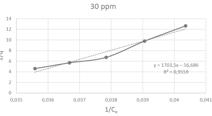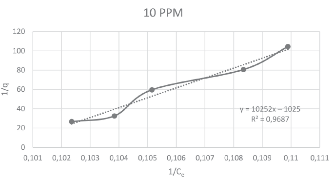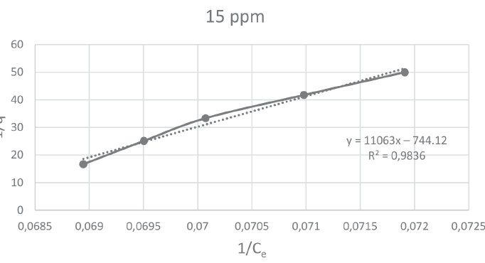 A continuación, se muestran las figuras 5, 6, 7 y 8 que corresponden a las isotermas de Langmuir para las concentraciones de 10, 15, 20 y 30 ppm de Pb, respectivamente. En ellas se pueden observar que el mayor coeficiente de correlación (0,9836) lo obtuvo la isoterma con concentración de 15 ppm.