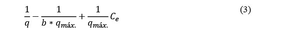 Donde q es la cantidad de soluto que es absorbido por la biomasa para cada uno de los reactores en un tiempo determinado (mg/g); qmáx. es la capacidad máxima de adsorción (mg/g), Ce es la concentración en equilibrio; b es el parámetro de la ecuación relacionada con la afinidad del biosorbente por los iones de Pb.