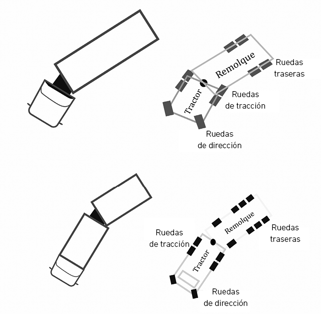 El modelado del tráiler se realiza a partir de un análisis geométrico, aplicando un procedimiento de movimiento en retroceso en un pequeño intervalo de tiempo, de manera que se generan las condiciones de posición en un instante t y en un instante t + Δt. En la figura 1 se muestra cómo está compuesto el tráiler en dos versiones: en la parte frontal se encuentran las ruedas de dirección y las ruedas de tracción, mientras que en la parte de la carga tiene únicamente ruedas de giro libre.