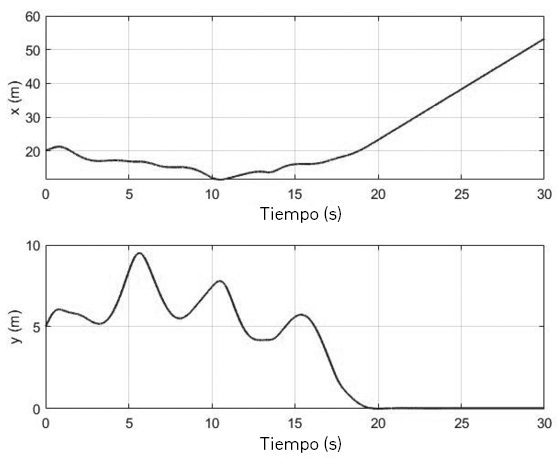 Con los valores iniciales y deseados que se indican a continuación, se obtienen las respuestas que señalan las figuras 18 y 19: xi = 20, yi = –25, θ1 = 45°, θ2 = 45°, y* = 0.