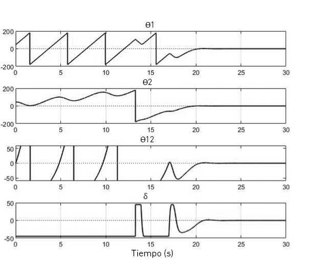 De esta manera se genera una adecuada convergencia del sistema hacia sus valores deseados. Aun así, pese a su adecuada convergencia, una variable del sistema llega a trabajar fuera del rango permisible. Se trata de la variable θ12 que corresponde al ángulo de unión entre los dos cuerpos —que no debe exceder un rango de [–90° a 90°]— y que no es limitada por el programa porque no es una variable de control, sino una variable de estado generada automáticamente por el sistema. Como consecuencia, en ciertos momentos, dicho ángulo excede el rango permisible y genera un mal funcionamiento en la respuesta del sistema. Es necesario evitar que se produzca este fallo.