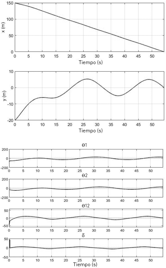 Mediante este análisis, se utiliza el algoritmo en MATLABTM para realizar la demostración de funcionamiento en avance del tráiler. Se debe tener claro que se debe mantener la referencia de la etapa de linealización donde se realizó la aproximación de θ2 ≈ 0, por lo que las referencias de ángulos y desplazamiento han de ser acordes a este punto de operación.