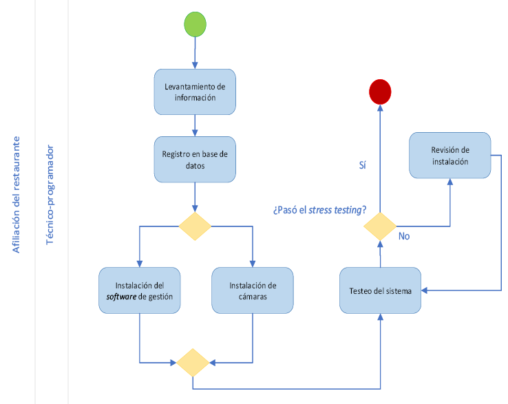 Una vez que el sistema reconozca los diversos contextos del restaurante, la empresa afiliada recibirá un programa que podrá instalar en cualquier laptop con sistema operativo Windows 7 o mayor. El programa le permitirá al restaurante gestionar las reservas, comandas y pagos de forma integral y eficiente. Paralelamente, se instalarán las cámaras de reconocimiento en el local. El programa será testeado bajo la modalidad de stress testing para identificar posibles vulnerabilidades y garantizar que funcione perfectamente.