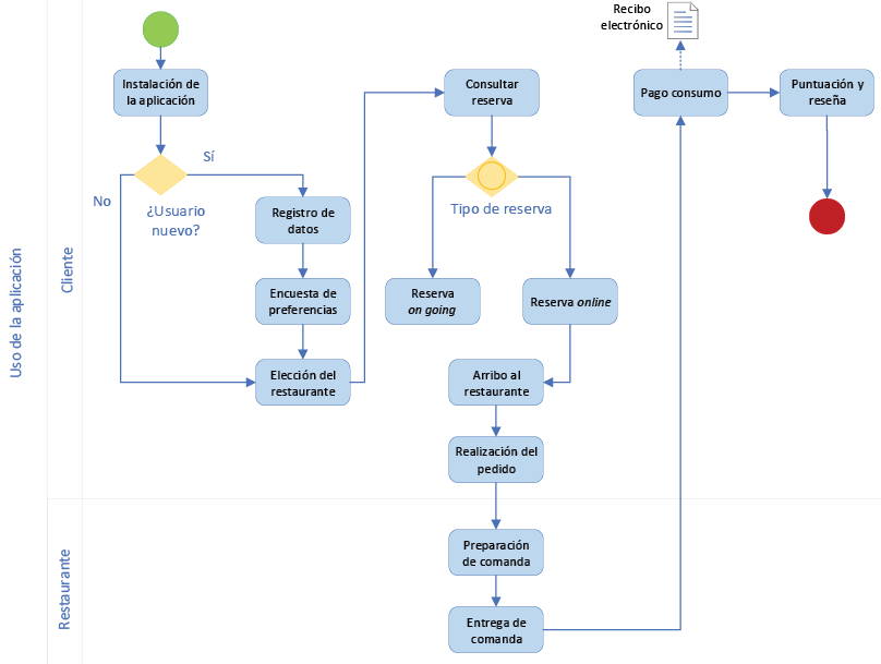 El sistema de gestión customer centric propuesto es un sistema de administración y control basado en inteligencia artificial que integra las operaciones del restaurante en favor del cliente final. Mediante una aplicación móvil, que requiere que el usuario cree un perfil de inscripción, podrá realizar las operaciones de reserva, monitoreo de aforo en tiempo real, reseña y pago. Además, al contar con una opción de suscripción premium, posibilitará la apertura de loyalty programs entre los restaurantes y los comensales para poder incentivar la recurrencia de estos. Cabe mencionar que la implementación de un sistema informático atado a la operación end-to-end del restaurante le permitirá a este monitorear la fluctuación y comportamiento de los comensales y las comandas, con el fin de generar información para la toma de decisiones y mejora continua del servicio; además, le otorga la capacidad de ser data driven, lo que permitirá el análisis de toda la información recopilada.