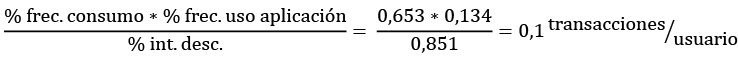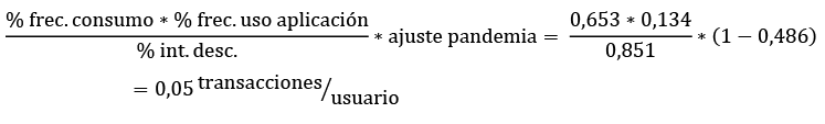 Sin embargo, dado el impacto producido por la pandemia, se debe hacer un ajuste de acuerdo con la frecuencia actual de los comensales. Por ello, para tener un indicador más preciso, el ajuste se basó en el informe presentado por Impulso PR y Marketing de Influencia, que señala que las búsquedas de restaurantes realizadas entre los meses de abril y julio del 2020 se redujeron en 48,6 % (como se cita en Salas Oblitas, 2020). El nuevo cálculo de la tasa de conversión nos dio un total de 0,05 transacciones por usuario.