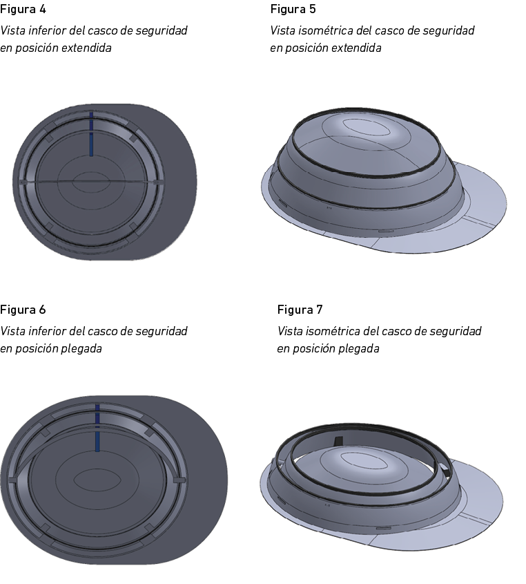 Con el software CAD Autodesk Inventor Professional 2018, se materializaron las imágenes del casco de seguridad plegable, que permite activar su forma de semicircunferencia con una sola mano por medio del sistema de giro radial y por efecto de la gravedad, que ejerce fuerza en sus partes móviles. El producto adquirió la forma de un casco que simula la circunferencia de la cabeza humana para luego asegurarla por medio de un elemento móvil que se libera y fija en dicha posición. Así, el producto se pudo usar sin inconvenientes para luego retirarlo plegando rápidamente con una sola mano un dispositivo de liberación del elemento movible. En conclusión, los resultados de esta fase permitieron la obtención de un producto que puede ser transportado en un espacio reducido, lo que disminuye los costos de almacenamiento, mejora la vida útil del casco y mantiene su compatibilidad con repuestos y accesorios. Las figuras 4, 5, 6 y 7 presentan las vistas del producto.