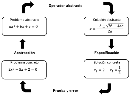 El TRIZ, siglas en ruso de teoría de resolución de problemas inventivos, es un método sistémico desarrollado por el ingeniero Genrich Altshuller (Terninko, 2001). Los problemas con solución desconocida —o problemas inventivos que regularmente generan contradicciones técnicas— mejoran un aspecto del problema, aunque pueden empeorar otros tantos. En cambio, la metodología TRIZ comienza por abstraer un problema concreto en busca de un operador que facilite alguna solución abstracta para llegar a concretarla, en lugar de hacerlo por ensayo y error (Nishiyama et al., 2013). La figura 3 esquematiza la idea anteriormente señalada con un ejemplo algebraico.
