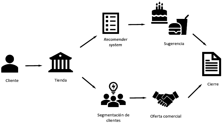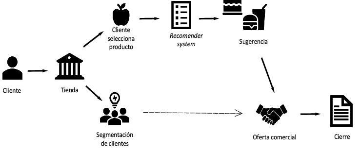 De forma complementaria, se ata a la estrategia comercial la segmentación de los clientes a través de un clúster. Así el sistema podrá identificar la categoría a la que pertenece el cliente cuando esté haciendo el ofrecimiento de productos, a través de cualquiera de las dos estrategias anteriores, y se podrá hacer un ofrecimiento atractivo con el fin de que se materialice la sugerencia hecha por el sistema de recomendación. A continuación, se presentan los respectivos flujos para cada una de las estrategias propuestas.
