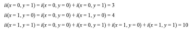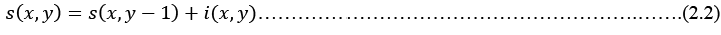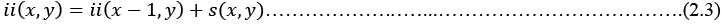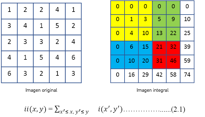 La descripción matemática (2.1) de la imagen integral proveniente de una imagen (imagen original). La imagen integral se puede calcular en un solo barrido de la imagen empleando el siguiente par de sentencias recurrentes: