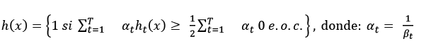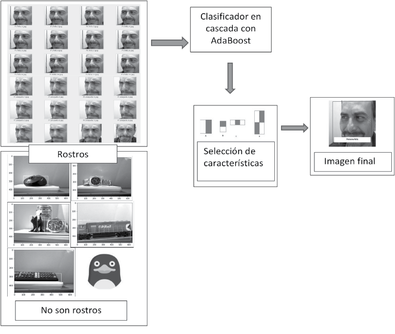 Es necesario realizar un proceso de entrenamiento supervisado para crear la cascada de clasificadores. Este proceso se lleva a cabo mediante un algoritmo basado en AdaBoost (Zerrouki et al., 2018), un metaalgoritmo adaptativo de machine learning cuyo nombre es una abreviatura de adaptive boosting. El boosting consiste en tomar una serie de clasificadores débiles y combinarlos para construir un clasificador fuerte con la precisión deseada. AdaBoost fue introducido por Freund y Schapire en 1995 para resolver muchas de las dificultades prácticas asociadas al proceso de boosting.