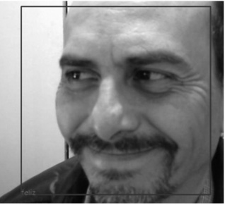Las siguientes fotografías son procesadas a través de la cámara web, frente a la persona en tiempo real. La figura 13 compara la imagen obtenida a través de la cámara web en tiempo real y hace un reconocimiento de los gestos de la persona enojada como una característica resaltante. La figura 14 compara la imagen obtenida a través de la cámara web en tiempo real y hace un reconocimiento de los gestos de la persona en estado de felicidad, como una nueva característica resaltante. Finalmente, en la figura 15 se compara la imagen obtenida a través de la cámara web en tiempo real y se realiza un reconocimiento de la persona, etiquetada con su nombre, de acuerdo con la base de datos proporcionada al sistema.