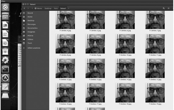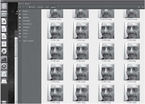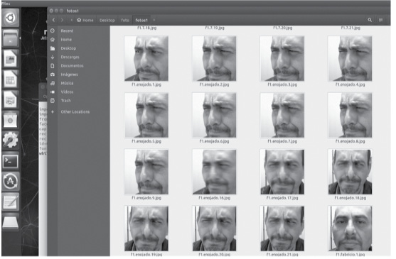 Un ejemplo de la base de datos obtenida se presenta en la figura 8. El dataset, en este caso, se consigue a través de la cámara web frente a la persona, que captura diferentes instantes. En total se tomaron 21 capturas o fotogramas, creando un archivo llamado trainingdata.yml.