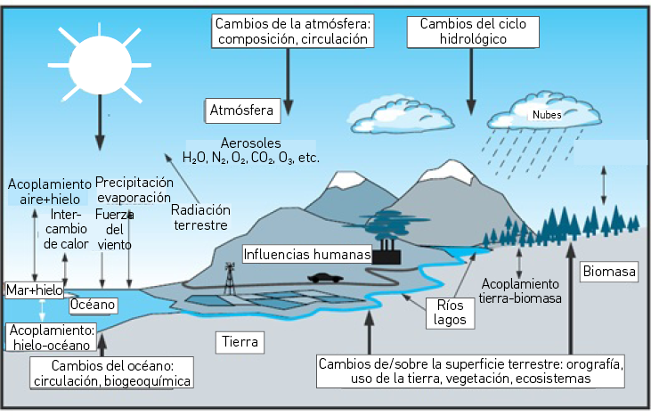 El sistema climático, según el National Centre for Atmospheric Research (NCAR), se encuentra conformado por océano-tierra-atmósfera, debido a que integra procesos fisicoquímicos en nuestra atmósfera e interactúa con el océano, continentes, hielo, nieve. Incluye los flujos de los procesos de radiación, convección, entre otros. Se representa con modelos acoplados (véase la figura 1).