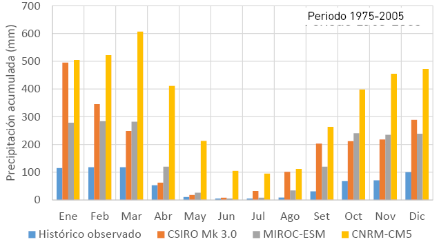 Precipitación acumulada promedio mensual observada e histórica de los modelos CSIRO Mk 3.0, MIROC-ESM y CNRM-CM5 para el periodo del 1975-2005
