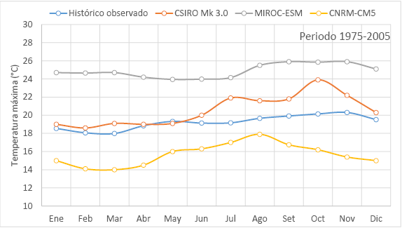El comportamiento de los valores históricos de los tres modelos evaluados sobreestima los valores reales de promedios mensuales observados de precipitación en el periodo 1975-2005, como se observa en la figura 3. Presentan distribuciones mensuales similares durante el año promedio, con valores de correlación de Pearson positivos mayores que 0,7, muy similares entre sí, que alcanzaron el mayor valor de correlación, 0,794, para el modelo de MIROC-ESM.