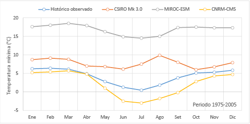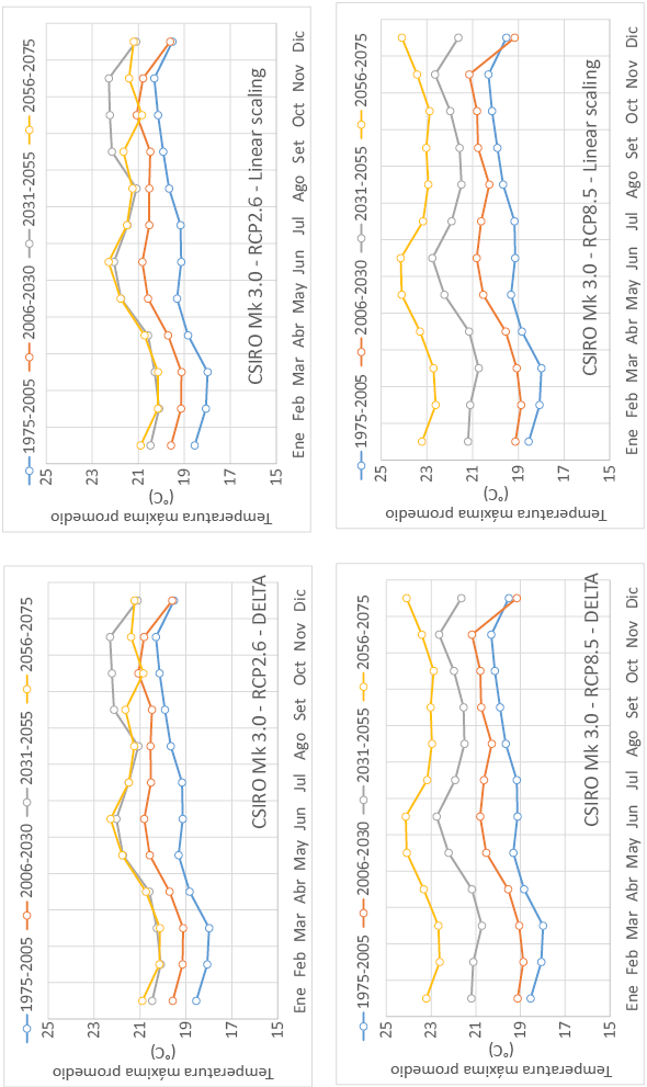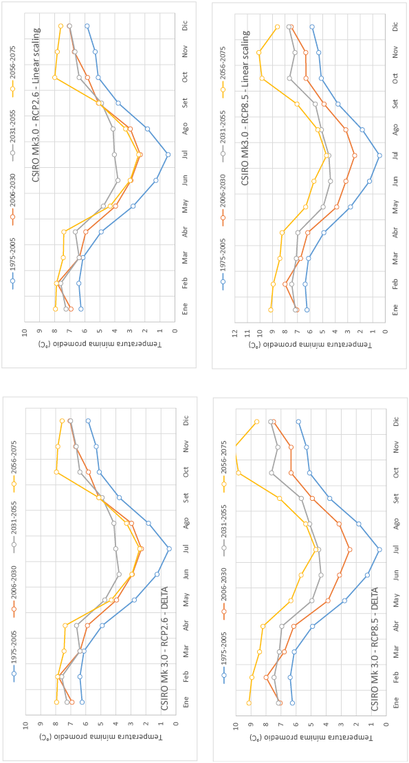 Temperatura mínima mensual proyectada por periodos con el modelo CSIRO Mk 3.0 y dos métodos de corrección