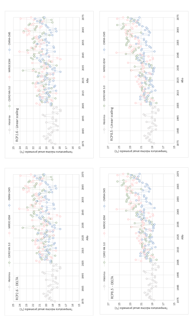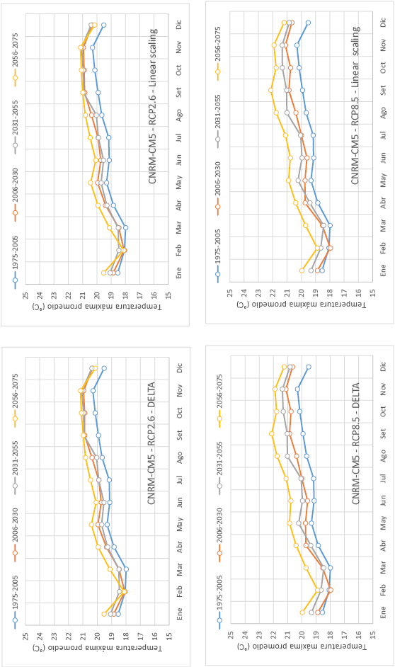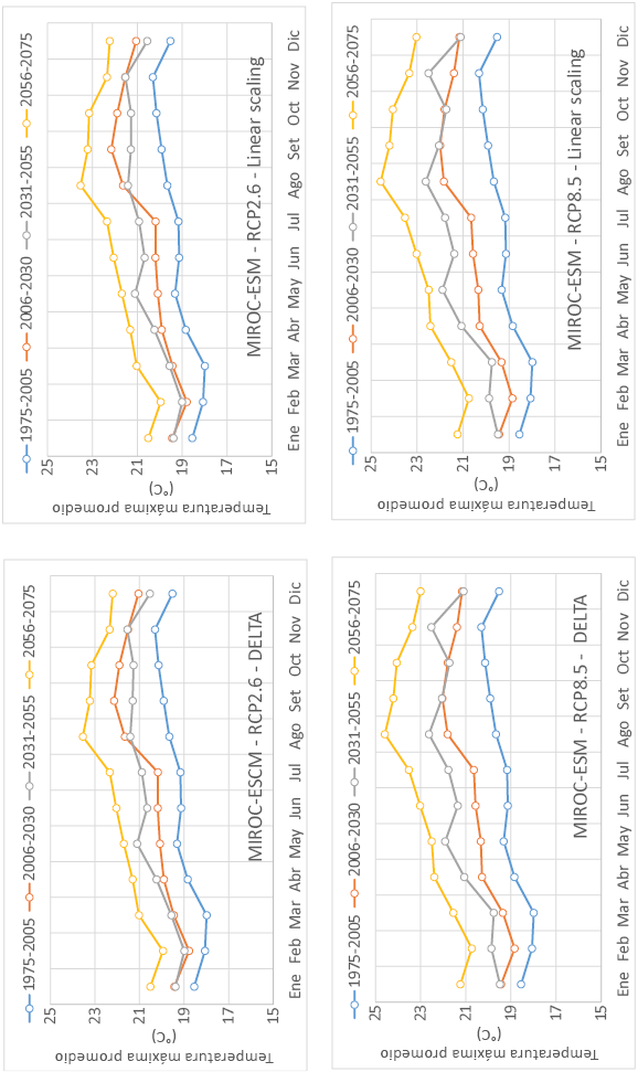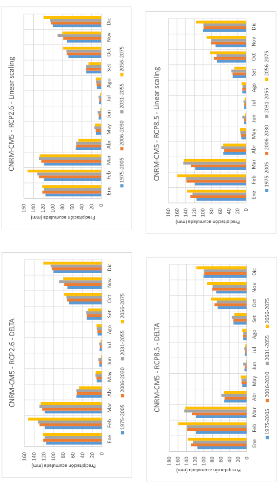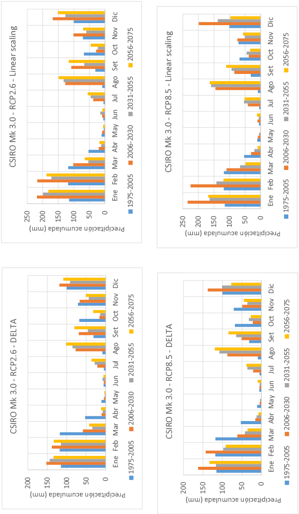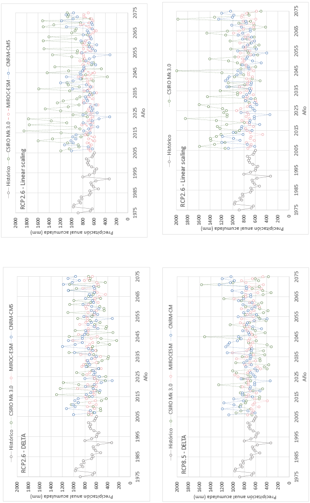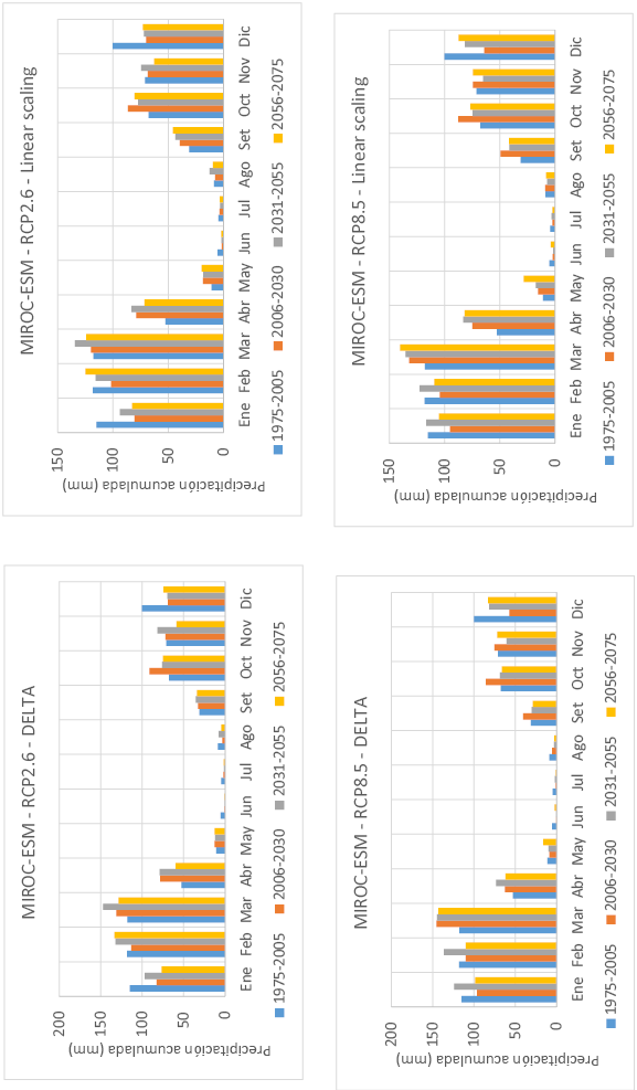 En este estudio, se utilizaron dos métodos para la corrección de sesgo: delta y escalamiento lineal para la precipitación y las temperaturas. Estos métodos de corrección de sesgo se realizaron diariamente desde 1975 al 2005.