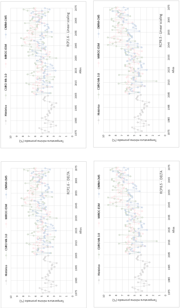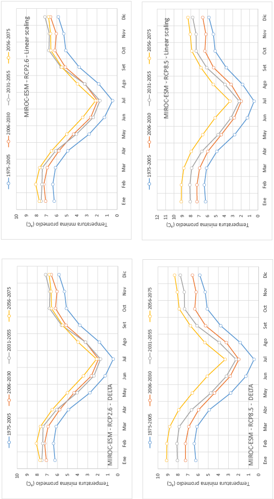La temperatura mínima mensual proyectada por periodos con el modelo CSIRO Mk 3.0, MIROC-ESM y CNRM-CM5, así como los dos métodos estadísticos de corrección, se presentan en las figuras 14, 15 y 16, respectivamente. La figura 17 (a-b-c-d) muestra la temperatura mínima anual proyectada para los modelos climáticos globales CSIRO Mk 3.0, MIROC-ESM y CNRM-CM5 para el periodo 1975-2075, con corrección delta y LS. Las proyecciones de las temperaturas mínimas exhiben incrementos significativos, según el análisis no paramétrico de Sen-Mann-Kendall, alcanzando aumentos de hasta 3 a 3,5 °C en los escenarios RCP8.5, con distribuciones uniformes en el modelo CSIRO Mk 3.0. Asimismo, ambos métodos de corrección brindan similares distribuciones mensuales de proyecciones.