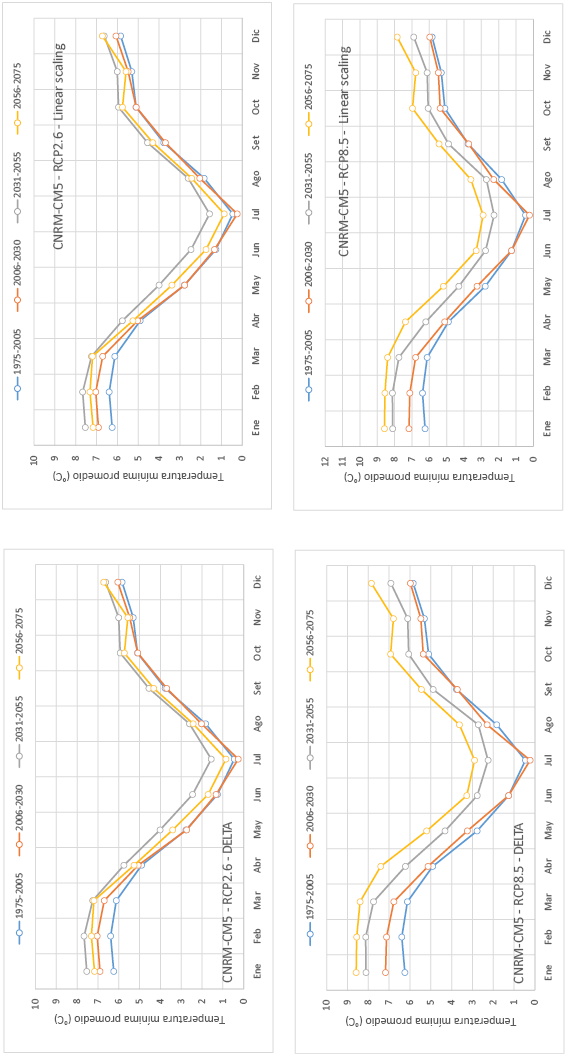 Temperatura mínima mensual proyectada por periodos con el modelo CNRM-CM5 y dos métodos de corrección