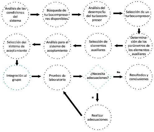 Para la selección e implementación del turbocompresor en un sistema OTEC, se adecuó y modificó la metodología de Wong et al. (2013), utilizada para la selección y adaptación de un turbocargador a un turboexpansor para un ciclo orgánico Rankine, de acuerdo con las necesidades requeridas del proyecto (véase la figura 2).