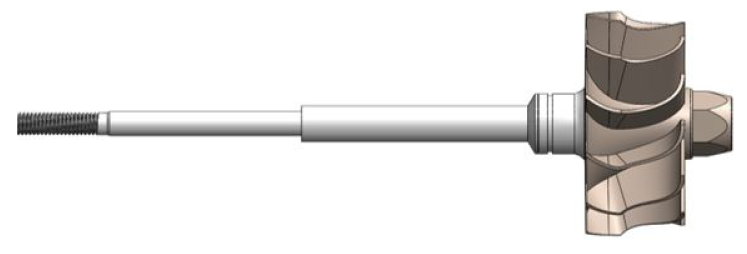 Para el reajuste de las ecuaciones del torque, se consideró el valor del momento de inercia (I) obtenido con el software SolidWorks, ya que comprende la geometría completa en lugar de un disco sólido, como se plantea en las ecuaciones utilizadas en el apartado “Análisis para la selección del turbocompresor”. En la figura 7, se presenta la geometría de la turbina realizada en el software SolidWorks y en la tabla 3 se muestra el valor del momento de inercia de la turbina.