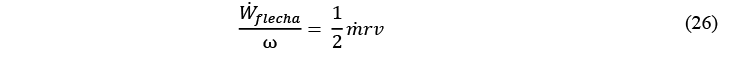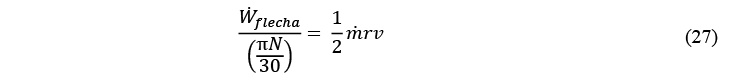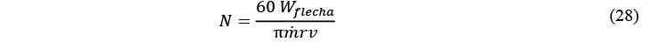 Finalmente, se simplificó y despejó de la ecuación anterior. Así se obtuvo la ecuación 28, que permite conocer las revoluciones por minuto necesarias para alcanzar la potencia de flecha dependiendo del radio del rodete de la turbina.