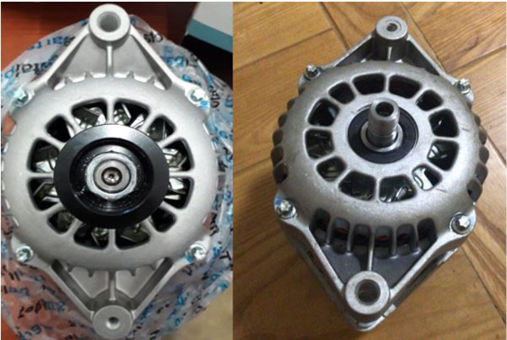 Debido a que el sistema de acoplamiento seleccionado requiere únicamente de la entrada hexagonal con medida de 5/16 in, la polea acoplada al eje del alternador debe ser retirada, puesto que únicamente añade peso al eje provocando una mayor resistencia al giro. En la figura 11, se puede apreciar el alternador con la polea y el alternador sin la polea.