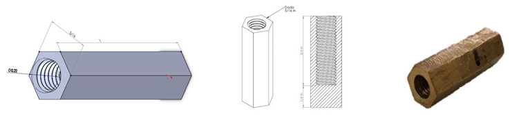 Pieza de acoplamiento. Diagrama 3D, plano y pieza manufacturada en latón