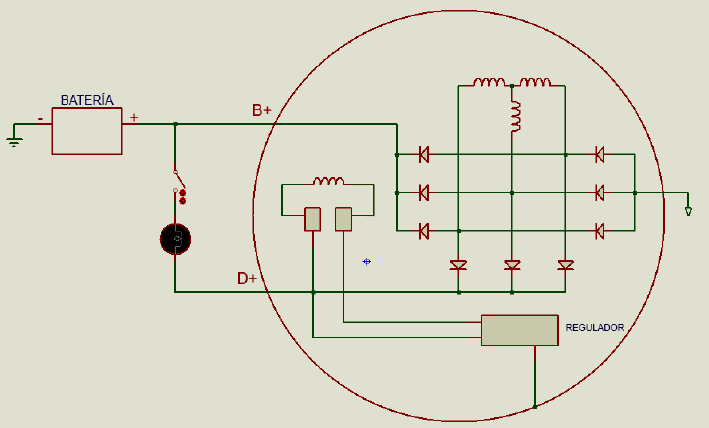 El diagrama encerrado por un círculo representa al alternador con su regulador acoplado. La terminal con la simbología B+ representa la salida para la carga de corriente e irá conectada directamente a la terminal positiva de la batería Trojan. En cambio, la terminal con la simbología D+ representa el circuito de excitación y se conecta de forma paralela a la conexión de la terminal B+, con la diferencia de que esta irá conectada a una lámpara de 12 V que se encenderá inmediatamente simulando la luz testigo del tablero de un automóvil y se deberá apagar al momento de alcanzar las rpm necesarias para inducir el alternador, creando un campo magnético que propiciará un potencial eléctrico positivo a la batería.