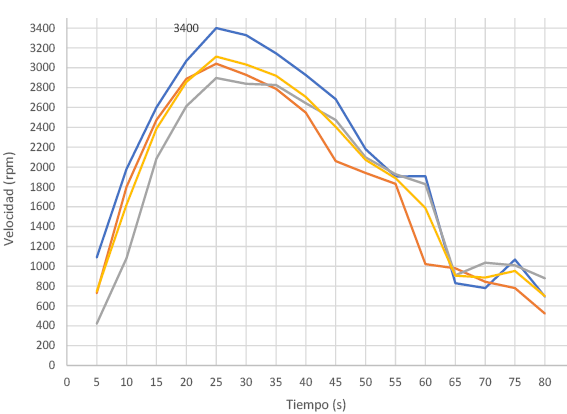 En la figura 16, se presentan los resultados de las rpm obtenidas respecto al tiempo. Como se puede observar, la turbina acoplada al generador eléctrico alcanza un máximo de 3400 rpm a los 25 segundos y comienza a descender debido a la caída de presión del compresor de aire.