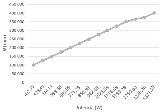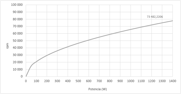 Esto quiere decir que el turbocompresor K16 requiere un total de 73 482,2206 rpm para producir 1250 W. Por tanto, no existe un riesgo de fractura o desgaste, puesto que se encuentra dentro de su rango de trabajo normal. En la figura 9, se puede observar el comportamiento de la potencia de flecha de la turbina en relación con las rpm generadas.