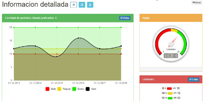 En la figura 5, se muestra, a modo de ejemplo, la interfaz de usuario del indicador “Número total de becas de iniciación CyT otorgadas” implementado en el sistema, con su información detallada. Puede notarse la evolución del indicador en el periodo considerado, el indicador de aguja mostrando la medición en referencia al 31-12-2018 y los umbrales definidos. Con este diseño puede analizarse cada indicador de forma particular, luego del primer análisis general obtenido a partir del TC implementado.