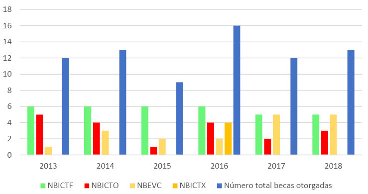 En la figura 2 se muestra, mediante un gráfico de barras, el tipo y número de becas de iniciación CyT otorgadas por año. En color azul se indica el número total, es decir, el indicador analizado.