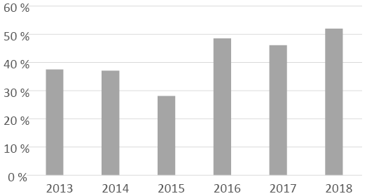 En la figura 3 se muestra, mediante un gráfico de barras, el valor porcentual de becas de iniciación otorgadas por año, en relación con las postulaciones totales por año.
