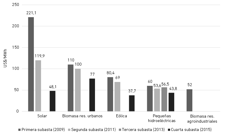 Se puede apreciar que la energía eólica tuvo como resultado una importante disminución del precio promedio por MWh, desde la ejecución de la primera subasta, realizada en el 2009, hasta la cuarta, llevada a cabo en el 2015. Pasó de valer 80,4 $/MWh en 2009 a 37,7 $/MWh en 2015. Con miras a mejorar la competitividad de la industria eléctrica en el Perú y cumplir con objetivos ambientales definidos, resulta crítico contar con un empleo de energías renovables competitivo, comparándolo con las experiencias de otros países más desarrollados en este rubro; en esa comparación, el precio de la energía resulta ser un factor importante.