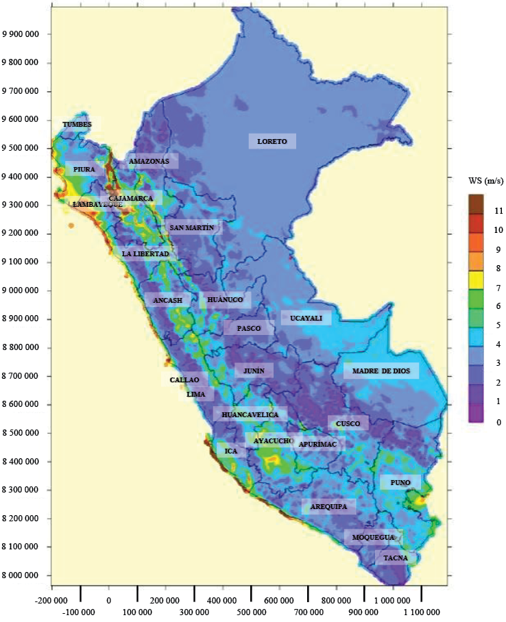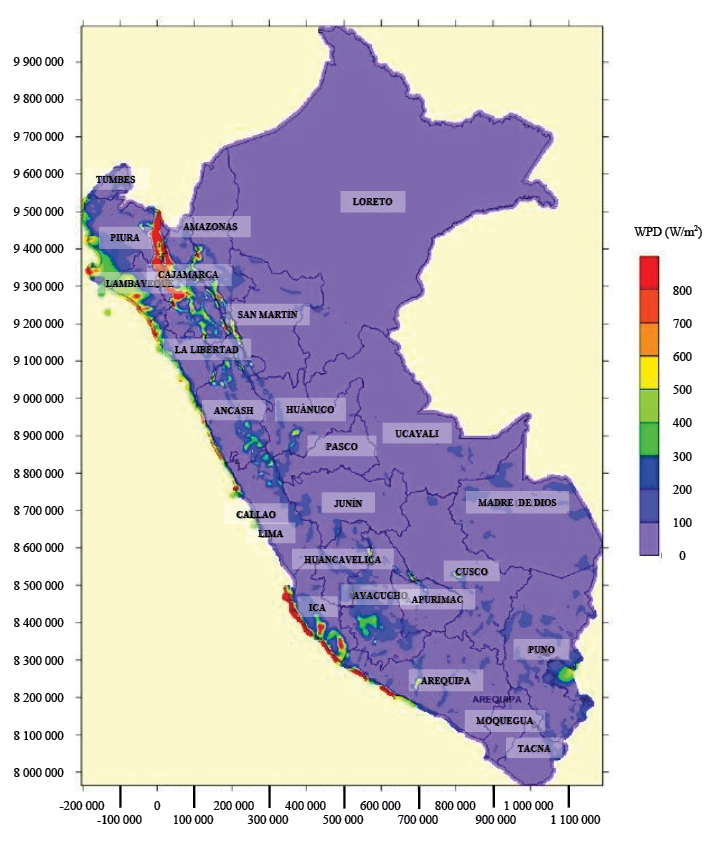 Como se observa en el mapa, la zona con mayor velocidad media anual del viento a 100 metros es la costa. En esta predominan los departamentos de Piura, Lambayeque, La Libertad, Áncash, Lima, Ica y Arequipa. Para el caso de la sierra, no se muestra una velocidad media anual del viento que sea significativa, con excepción del departamento de Cajamarca. A partir de la Figura 2, se evidencia que se trata de nueve departamentos los que poseen un considerable potencial para la generación de energía eólica y que la mayoría están localizados en la costa del Perú.