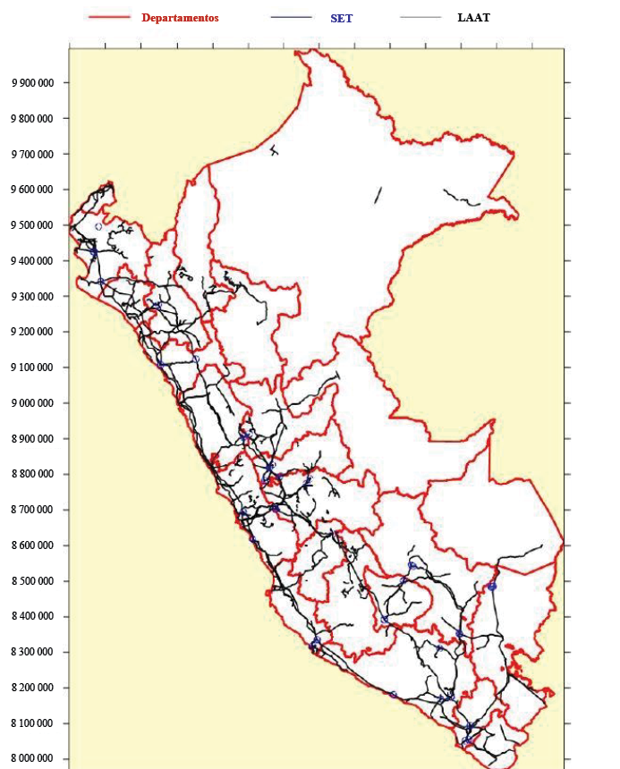 Mapa de las principales subestaciones eléctricas (SET) y líneas de alta tensión (LAAT) del Perú