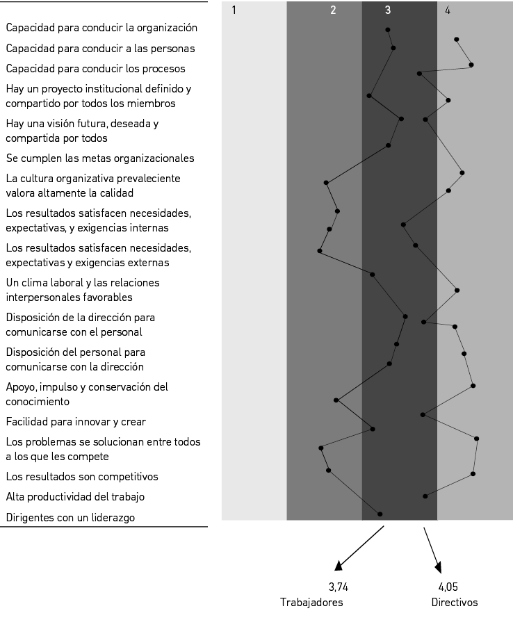 La aplicación de la herramienta sobre calidad directiva, que se refleja en la Figura 8, percibe obtener la valoración de los propios directivos sobre su capacidad en los temas de dirección y la mirada de los trabajadores sobre su gestión. Como se puede apreciar, las percepciones de uno y otro difieren en cada uno de los aspectos.