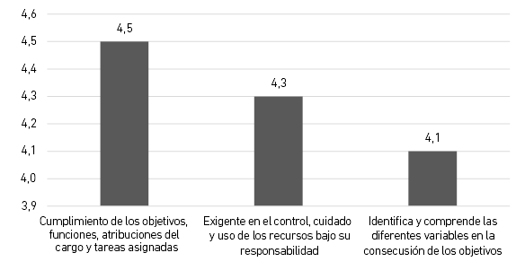 Los indicadores planteados en la encuesta diseñada guardan relación con la clasificación de las competencias directivas que exponen los expertos (Cardona & García Lombardía, 2005). Para las competencias estratégicas en la Figura 4, se valoran el cumplimiento de los objetivos, funciones y atribuciones del cargo con una media de 4,05, la más valorada; le sigue la exigencia en el control, cuidado y uso de los recursos bajo su responsabilidad con el 4,03 y, a continuación, identifica y comprende las diferentes variables en la consecución de los objetivos con 4,1.