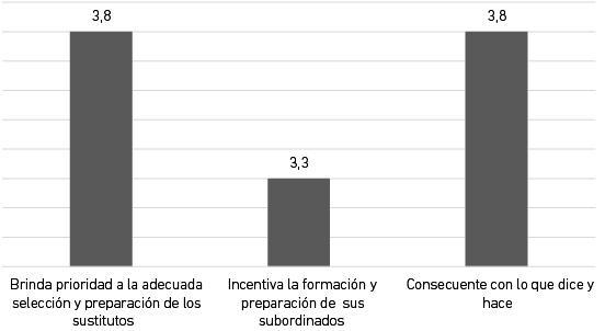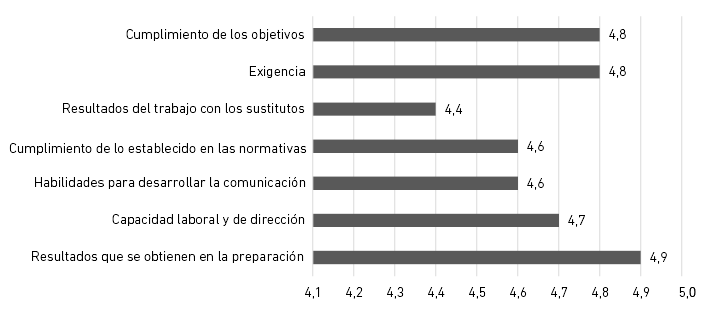 El indicador resultados del trabajo con los sustitutos, como se puede apreciar en la Figura 2, obtiene una media de 4,4. De los siete aspectos a evaluar, los mayores valores se encuentran en los resultados obtenidos en la preparación, el cumplimiento de los objetivos y la exigencia, lo contrario a los resultados del trabajo con los sustitutos, que obtiene menor puntuación. Aspecto que requiere atención y prioridad, si se tiene en cuenta que, entre las responsabilidades de cualquier directivo, están el desarrollo, la potenciación y preparación de sus sustitutos.