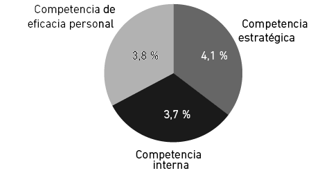 La representación gráfica de la Figura 7 resume las tres dimensiones de las competencias directivas. El mayor puntaje se refleja en las competencias estratégicas con el 35 %. Le siguen las competencias de eficacia personal con el 33 %. Por último, las competencias a lo interno de la organización con ٣٢ %.