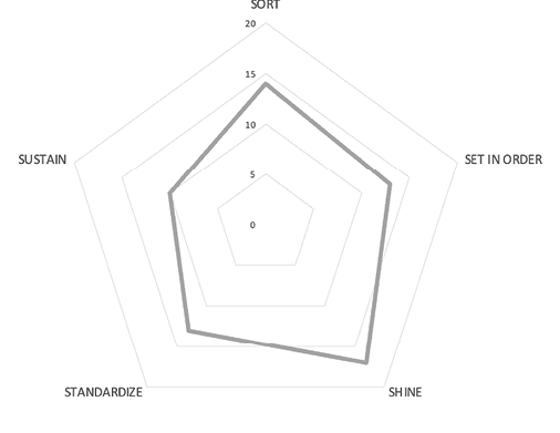 Luego de una semana de aplicado lo expuesto previamente, se volvió a realizar una encuesta a las operarias, a modo de auditoría final, en la que se pudo apreciar una mejora considerable con respecto a la primera auditoría. Con las disposiciones propuestas y aplicadas, los valores en puntos débiles como “Sort” y “Standarize” mejoraron en un 100 % y 95 % respectivamente. A manera general, en la Figura 3.13, se puede apreciar que la empresa mantiene un 97,5 % en su gestión actual. Sin embargo, aún existen posibles mejoras relacionadas a la gestión visual y habilidades blandas.
