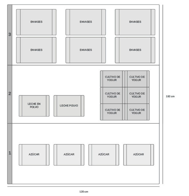 Para la segunda “S”, que está relacionada con la organización, se decidió aplicar una propuesta de layout para los racks del área del almacén de materia prima, debido a la pésima disposición de los insumos y el desorden dentro del área que tenía la empresa. Los principales insumos, como el azúcar, el cultivo de yogur y la leche en polvo, llegan en costales de 50 y 25 kg. En la Figura 3.7, se puede apreciar que el layout del rack cuenta con tres niveles. El primer nivel está compuesto por el azúcar, la cual estaría almacenada en recipientes propuestos para mantenerla en un correcto estado, además de tener un fácil acceso a ella. En el segundo nivel, se encuentra ubicada la leche en polvo en sus respectivos empaquetados, además de los cultivos de yogur. Por último, en la parte superior del rack, en el tercer nivel, se encuentran los envases y etiquetas, pues al ser un material liviano, el acceso a este es sencillo. Cada nivel está compuesto por cajas organizadoras de plástico, detalladas en sus medidas respectivas, para mantener los insumos en mejor estado.