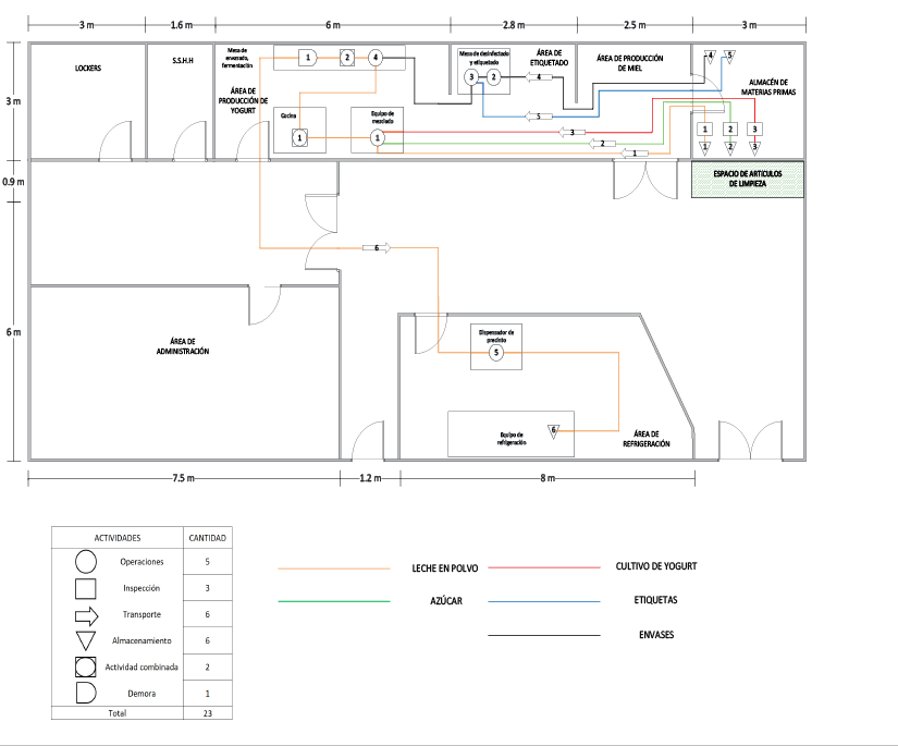 ABSTRACT. The purpose of this investigation was to apply the Lean 5S methodology to the Greek yoghurt production process of a Peruvian microenterprise with the aim of analyzing and propose improvements in order to promote a culture of continuous improvement. The methodology comprises the 5 stages of sort, set in order, shine, standardize and sustain. Several engineering tools were applied to this end, such as a process operations diagram, route diagram, time study, VSM and Load/Distance Matrix. The research achieved a reduction in production time, with indicators such as a 40 % reduction in the load-distance matrix, a 36,8 % reduction in travel time, a