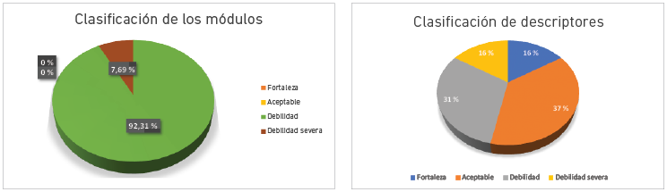 Se realizó la evaluación cuantitativa para los 204 descriptores de los trece módulos pertenecientes al modelo de referencia de los inventarios (MRInv). Al introducir las respectivas puntuaciones en el MRInvAudit, perteneciente al modelo, permitió calcular automáticamente el nivel de gestión de inventario de los almacenes de misceláneas. Luego de aplicada la encuesta, se comprobó que el sistema logístico presenta un bajo nivel de gestión de inventario (NGI), con un valor de 1,46 en una escala de 0 a 3, tal (véase la Tabla 1), debido a que el 92,31 % de los módulos del MRInv están clasificados como debilidad y que representan un cumplimiento del 49,02 %.