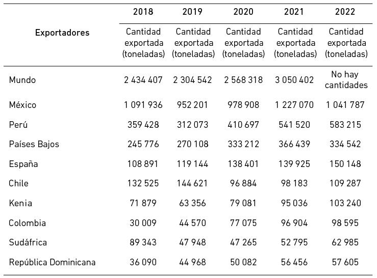 En la Tabla 1 se muestra la producción mundial de palta de los principales productores de palta entre el 2018 y el 2022. Del 2018 al 2021, la cantidad de palta exportada a nivel mundial aumentó de manera generalizada. Pasó de 2 434 407 toneladas, en el 2018, a 3 050 402 toneladas en el 2021. México, el mayor productor y exportador de palta del mundo, mostró un incremento notable en la cantidad exportada del 2018 al 2021, pero experimentó una disminución en el 2022 a 1 041 787 toneladas. A pesar de esta disminución, México sigue siendo el mayor exportador de palta en el 2022. Perú, los Países Bajos, España, Chile, Kenia, Colombia, Sudáfrica, la República Dominicana, Marruecos, los Estados Unidos, Sri Lanka, Francia e Israel también figuran en la lista de los principales exportadores. En general, estos países muestran una tendencia creciente en las exportaciones de palta del 2018 al 2022, con la excepción de los Estados Unidos, que muestra una disminución en el 2022. Sri Lanka es un caso interesante, ya que pasó de exportar solo 60 toneladas en el 2020 a 39 570 toneladas en el 2022.