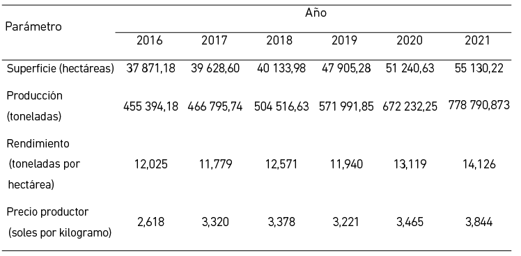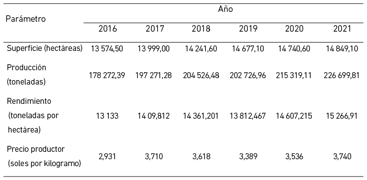 Parámetros productivos de palta en la región La Libertad 2016-2021
