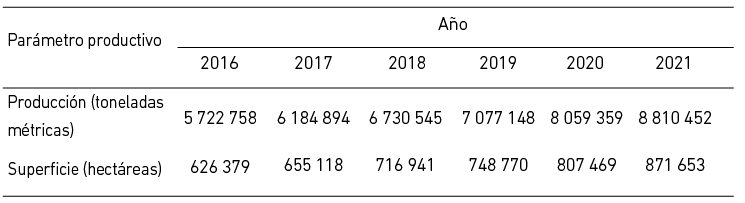 Parámetros productivos nacionales de palta 2016-2021
