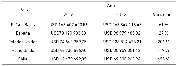 Principales mercados internacionales de palta peruana durante los años 2016-2022